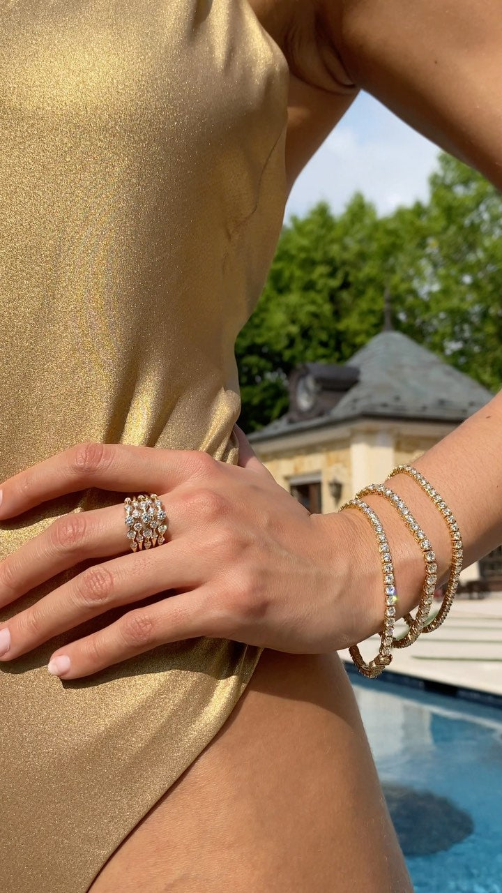 Brilliant, refined, and timeless, the Kwiat “Signature Tiara” diamond line bracelet is an extraordinary display of craftsmanship and luxury. Handcrafted in platinum, this bracelet features 63 round brilliant cut diamonds, each set in four-claw prong baskets that allow light to flow through every facet. With a total diamond weight of approximately 6.00 carats, graded G–H in color and VS2–SI1 in clarity, the bracelet radiates dazzling sparkle and sophistication.