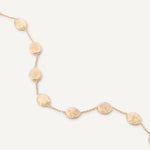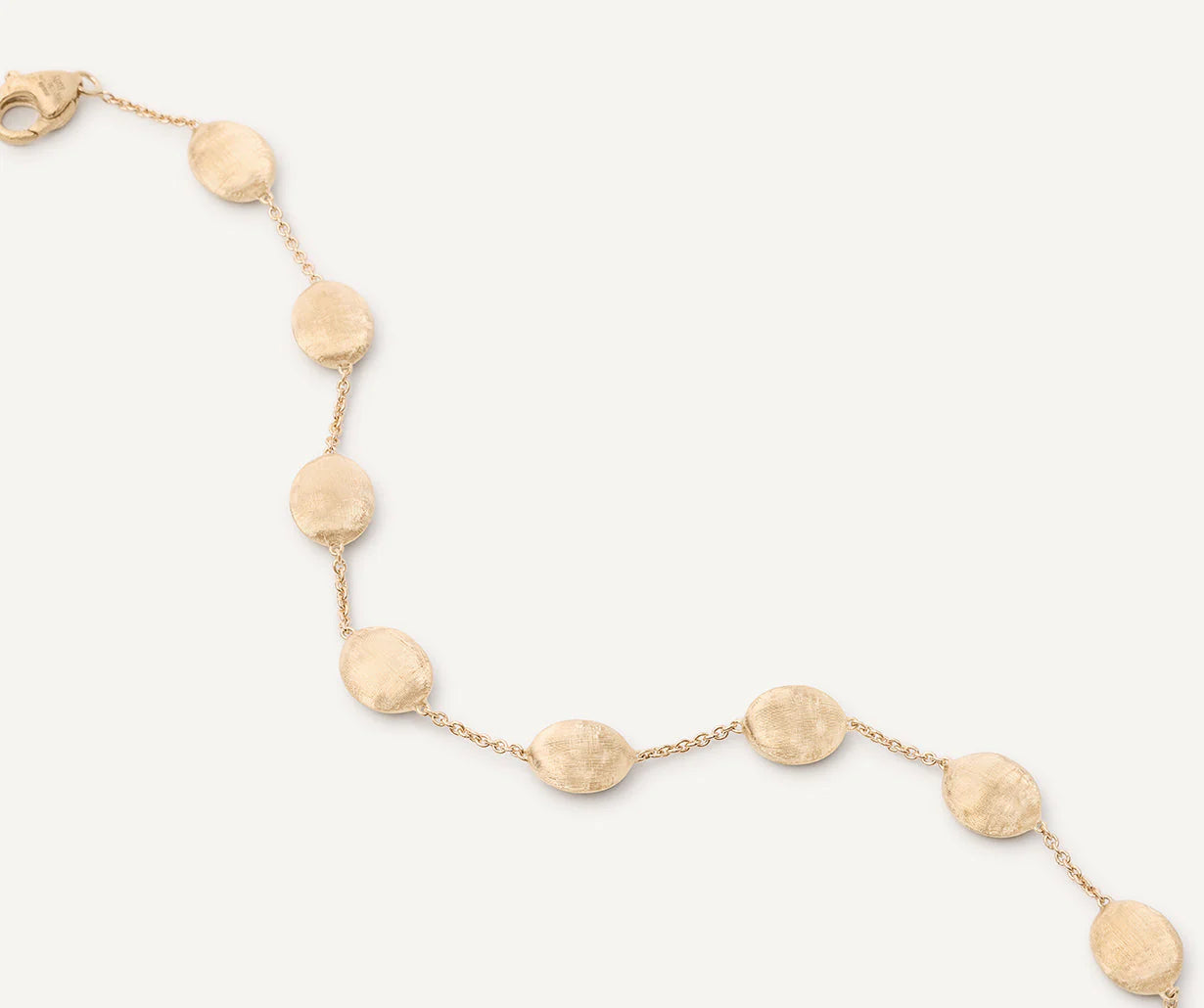 Light and delicate, this bracelet features medium oval elements in 18K yellow gold with an irregular surface, finely hand-engraved using an ancient Florentine technique.