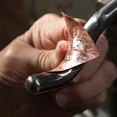 Anticlastic raising is a metal-forming technique where a flat sheet is shaped with a hammer over a sinusoidal (snake-like) stake. As the edges stretch and the center compresses, the metal curves in two directions at once, producing light, sculptural forms. The pattern of the sheet guides the final shape, yet many variations can emerge from the same starting piece—one of the reasons this technique is both expressive and uniquely Michael Good.
