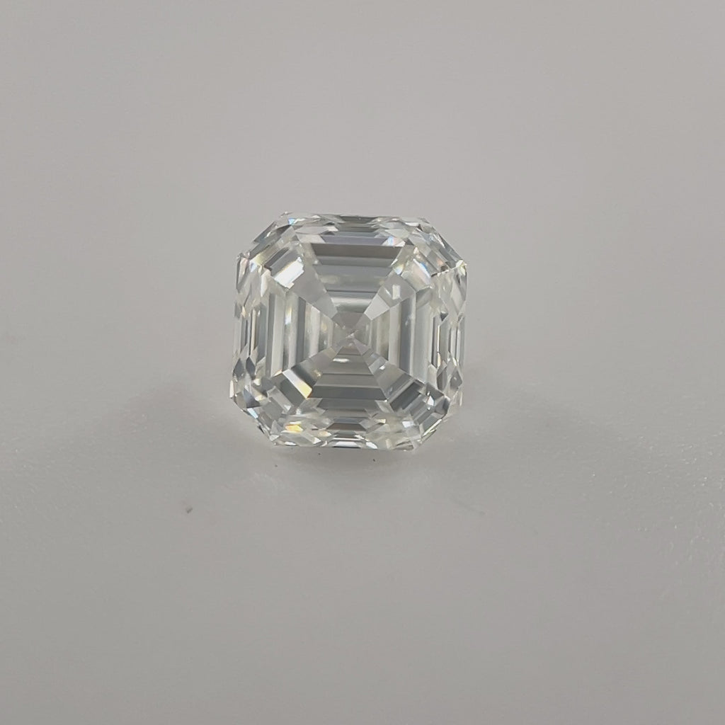 This diamond features a striking square emerald-cut silhouette, measuring 5.86 × 5.75 × 3.91 mm, with crisp step facets that create a hall-of-mirrors effect. Graded I in color and VS1 in clarity, it displays bright, clean brilliance with refined transparency and minimal inclusions—an ideal combination for an emerald cut, where clarity is a key component of beauty.